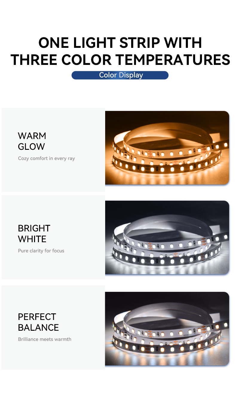 Cette conception à double température de couleur, haute luminosité, haute densité et anti-perles mortes bande lumineuse LED C'est une solution d'éclairage puissante, flexible et fiable. Non seulement elle fournit une lumière suffisante, mais elle ajuste également la couleur de la lumière selon les besoins et offre une excellente durabilité, ce qui en fait un choix idéal pour un éclairage moderne.